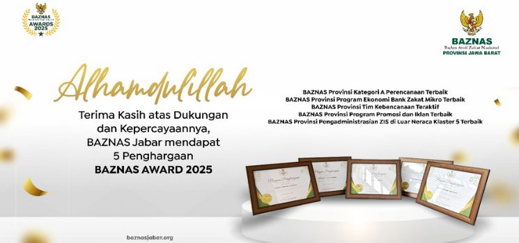 BADAN Amil Zakat Nasional (BAZNAS) Provinsi Jawa Barat kembali menorehkan prestasi membanggakan di tingkat nasional. Pada ajang BAZNAS Award 2025, BAZNAS Jabar berhasil meraih lima penghargaan bergengsi sekaligus.