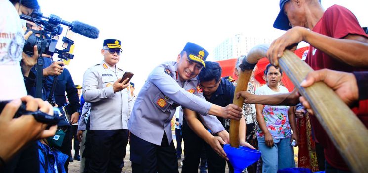 DIVISI Hubungan Masyarakat (Divhumas) Polri menggelar bakti sosial (baksos) dengan membagikan air bersih di wilayah Penjaringan, Jakarta Utara, Rabu (4/10/23).