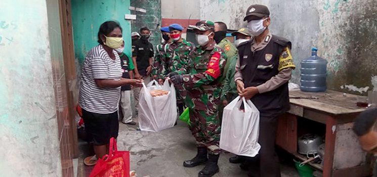 DANRAMIL 04/Jebres Kodim 0735 Surakarta Kapten Inf Paidi dan Anggota Babinsa bersama sama Camat Jebres dan Bhabinkamtibmas bagikan 500 Nasi Kotak dan sembako kepada warga wilayah Kecamatan Jebres.